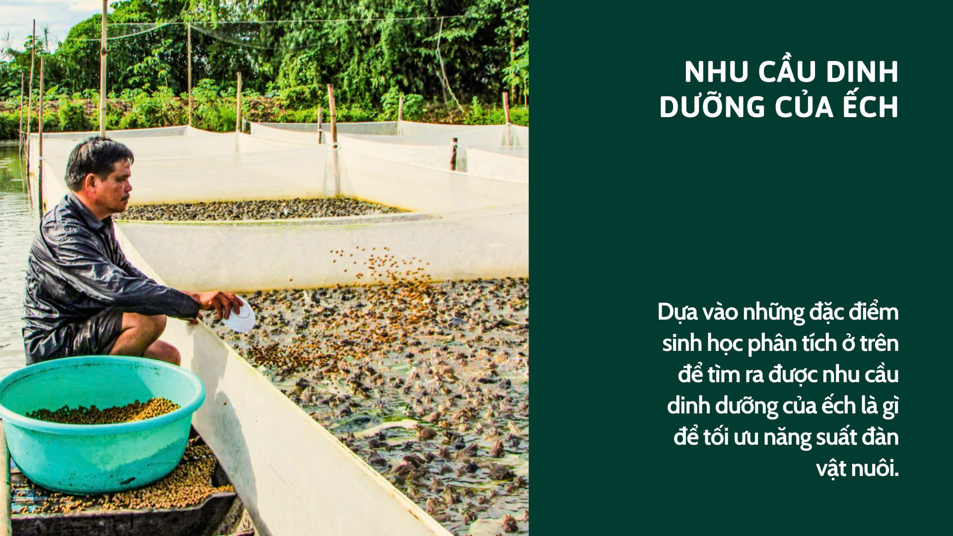 Theo các chuyên gia thì việc bổ sung dinh dưỡng, thức ăn đúng, đủ cho ếch là yếu tố hàng đầu quyết định chất lượng đầu ra. Dựa vào những đặc điểm sinh học phân tích ở trên để tìm ra được nhu cầu dinh dưỡng của ếch là gì để tối ưu năng suất đàn vật nuôi.