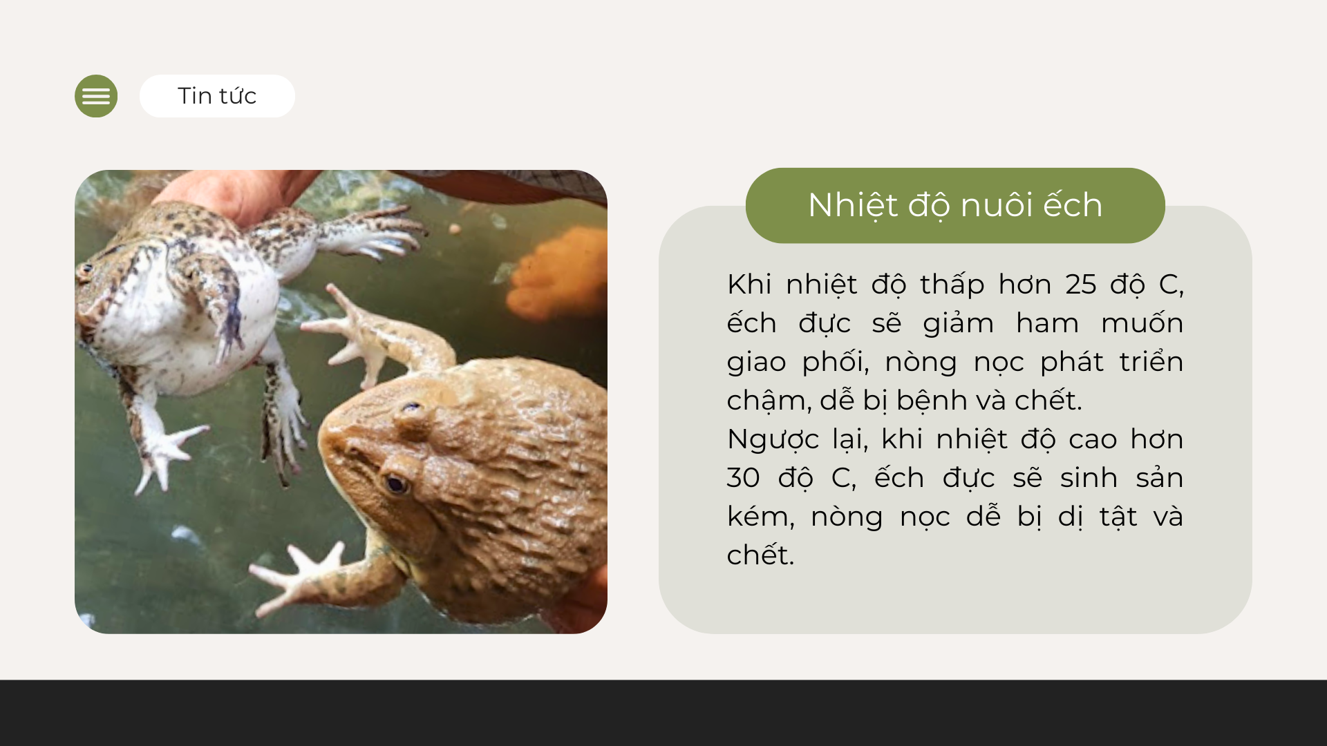 Nhiệt độ là một trong những yếu tố ảnh hưởng trực tiếp đến sức khỏe của ếch, bởi nó gắn liền với hoạt động sinh lý, sinh thái, nhu cầu dinh dưỡng của ếch. Khi nhiệt môi trường sống của ếch đạt nhiệt độ lý tưởng từ 25-30ºC thì đây là trạng thái lý tưởng nhất để ếch hấp thu chất dinh dưỡng một cách hiệu quả nhất.