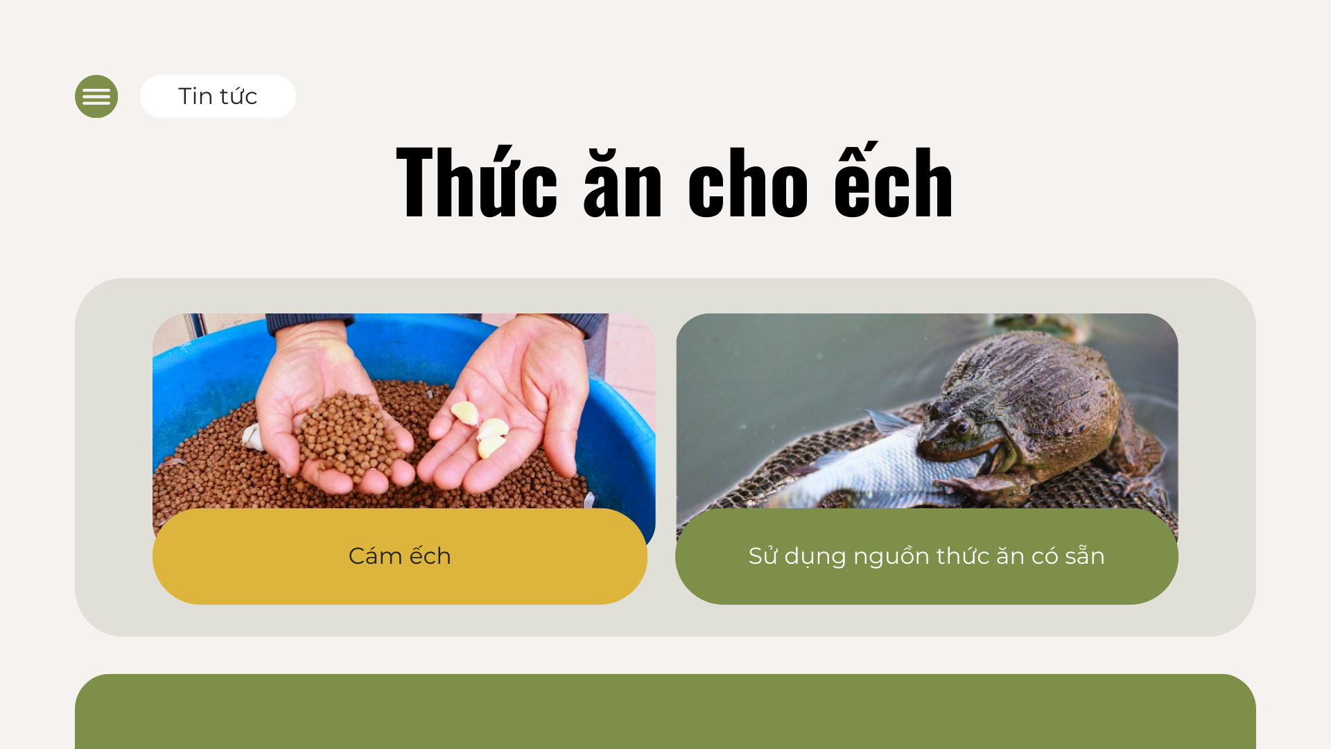 Đối với ếch thương phẩm nhu cầu dinh dưỡng của chúng khá cao. Vì thế sử dụng thức ăn đảm bảo đủ độ đạm từ 30-40% giúp đảm bảo sự đồng nhất và cân bằng dinh dưỡng trong khẩu phần ăn, đảm bảo phù hợp cho mỗi giai đoạn phát triển. Bà con có thể tận dụng các nguồn thức ăn tươi dễ dàng tìm kiếm tại địa phương như giun, tôm tép, châu chấu, cào cào,...Ngoài ra ếch cũng ăn được các loại thức ăn cám gạo, cám ngô, bột ngũ cốc trộn với thức ăn tươi.